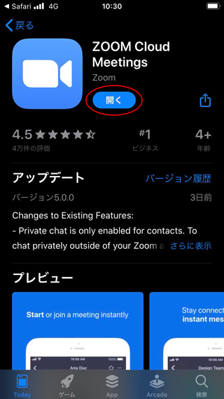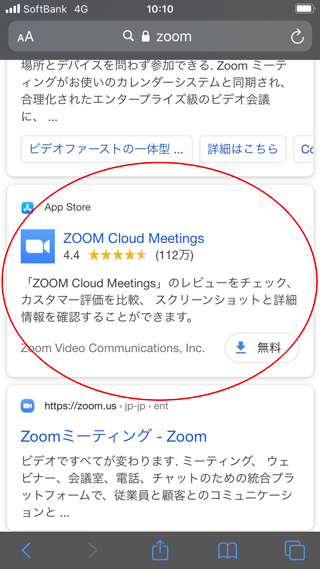 まずはインターネットに接続して、「Zoom」で検索し、「ZOOM Cloud Meetings」というアプリのページを探します。
